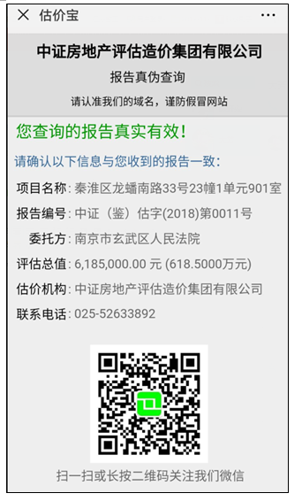 自2018年1月1日起,公司(含分公司)出具的房地產(chǎn)、土地、資產(chǎn)等非征收類評估報告,報告書中全部有報告審核系統(tǒng)自動生成的二維碼,通過掃描該二維碼即可查詢報告信息。價格評估和征收類評估報告沒有二維碼的可撥打025-52633892查詢報告真?zhèn)危?/span>